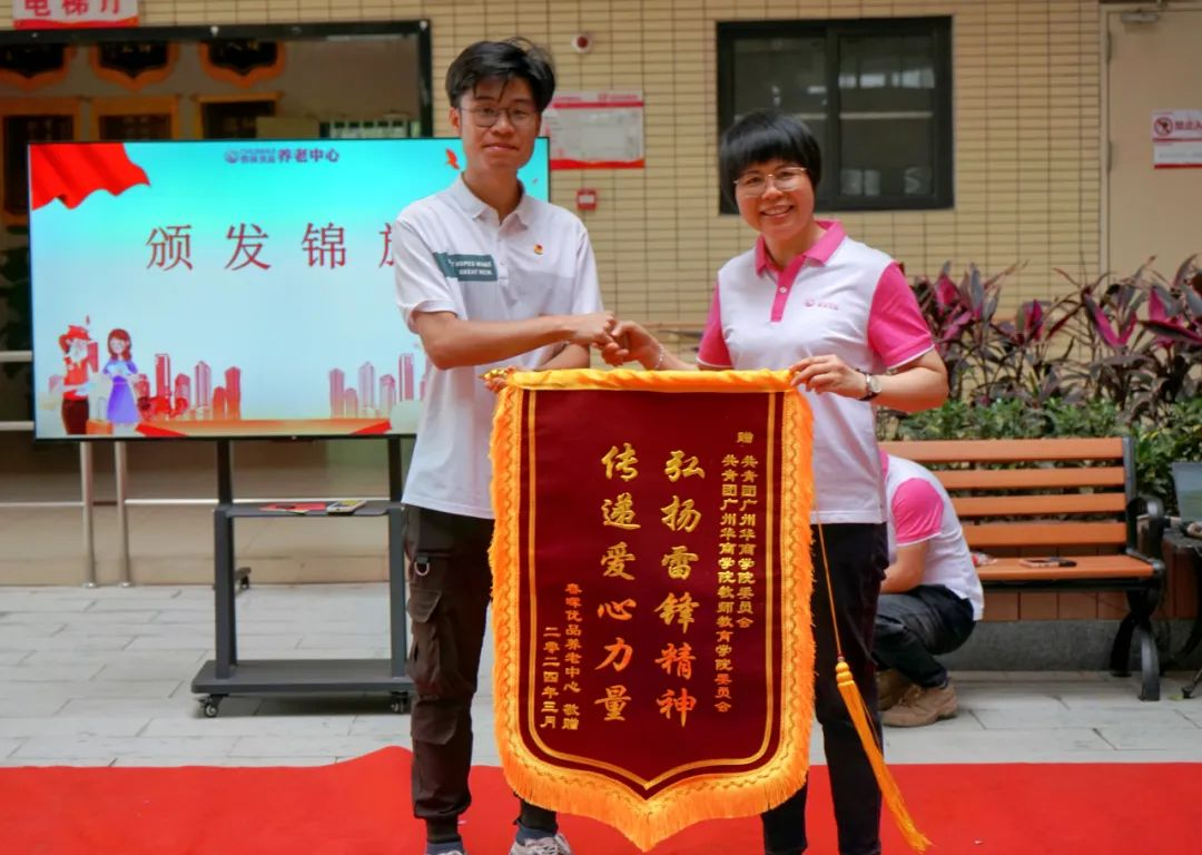 四会市春晖优品养老中心为我校团委、教师教育学院团委颁发“弘扬雷锋精神 传递爱心力量”锦旗,以表达对华商青年志愿者志愿服务的肯定与支持,以及温暖老人内心的善行善举的感谢。