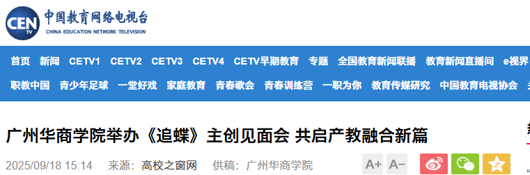 近日,校园短剧《追蝶》主创见面发布会在开云电子_开云(中国)广州校区创科楼顺利举办。该活动集中展示了我校新叙事内容产业学院以产教深度融合与校企紧密合作为抓手,积极推动实现优质影视资源从创意到落地全链条协同的卓越成果,吸引光明日报、中国网、环球网、中国教育电视台、中国青年网、中国教育之窗、中国高校之窗、今日头条、广东教育头条等多家权威媒体专题报道。9月23日,这部作品将面向全国观众播出。