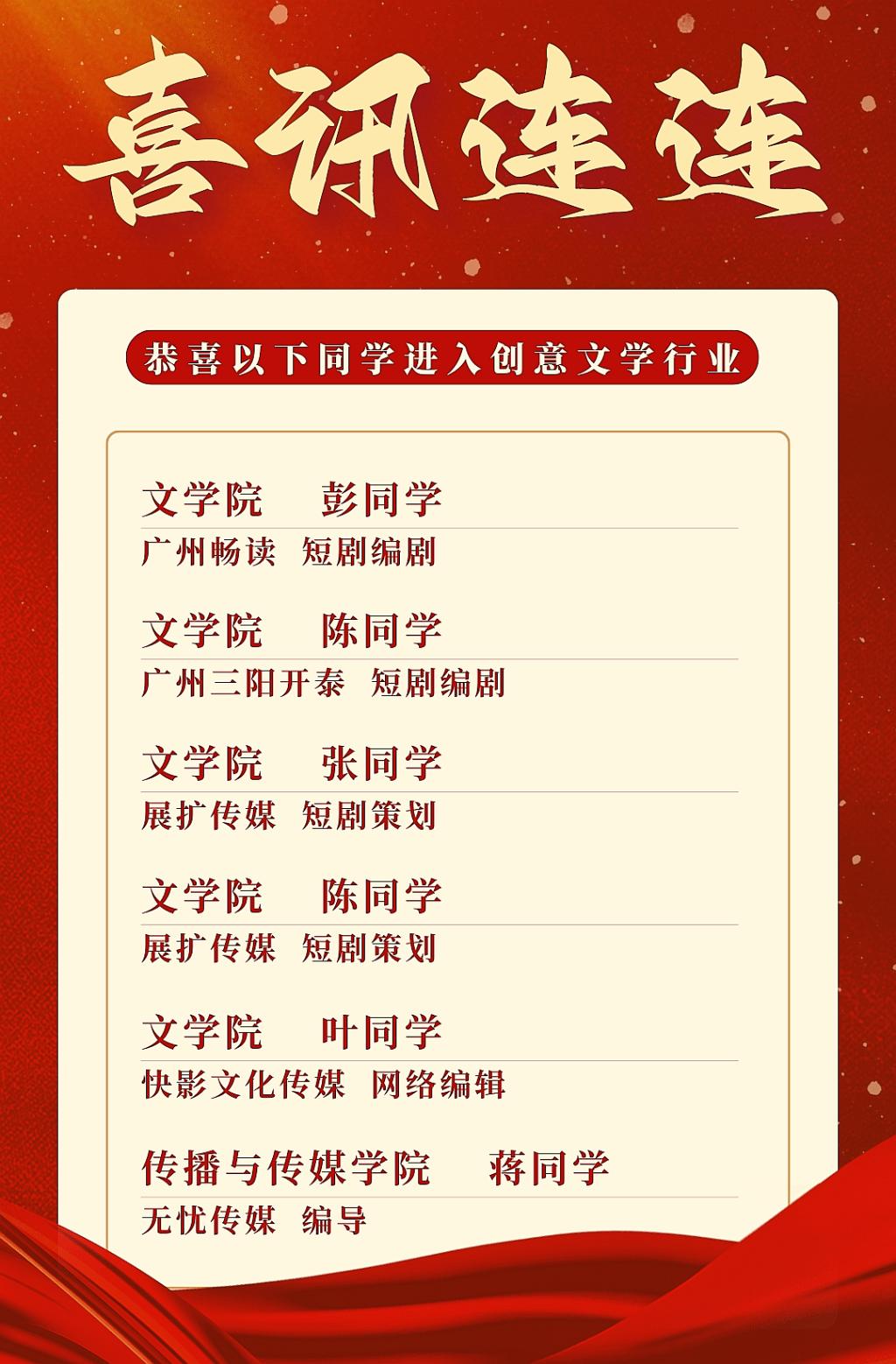 这批优秀学子凭借在创意文学领域锤炼的过硬本领,在行业中崭露头角,目前毕业生已就业人数近40人,学院还为大家推荐了近20家就业单位。
