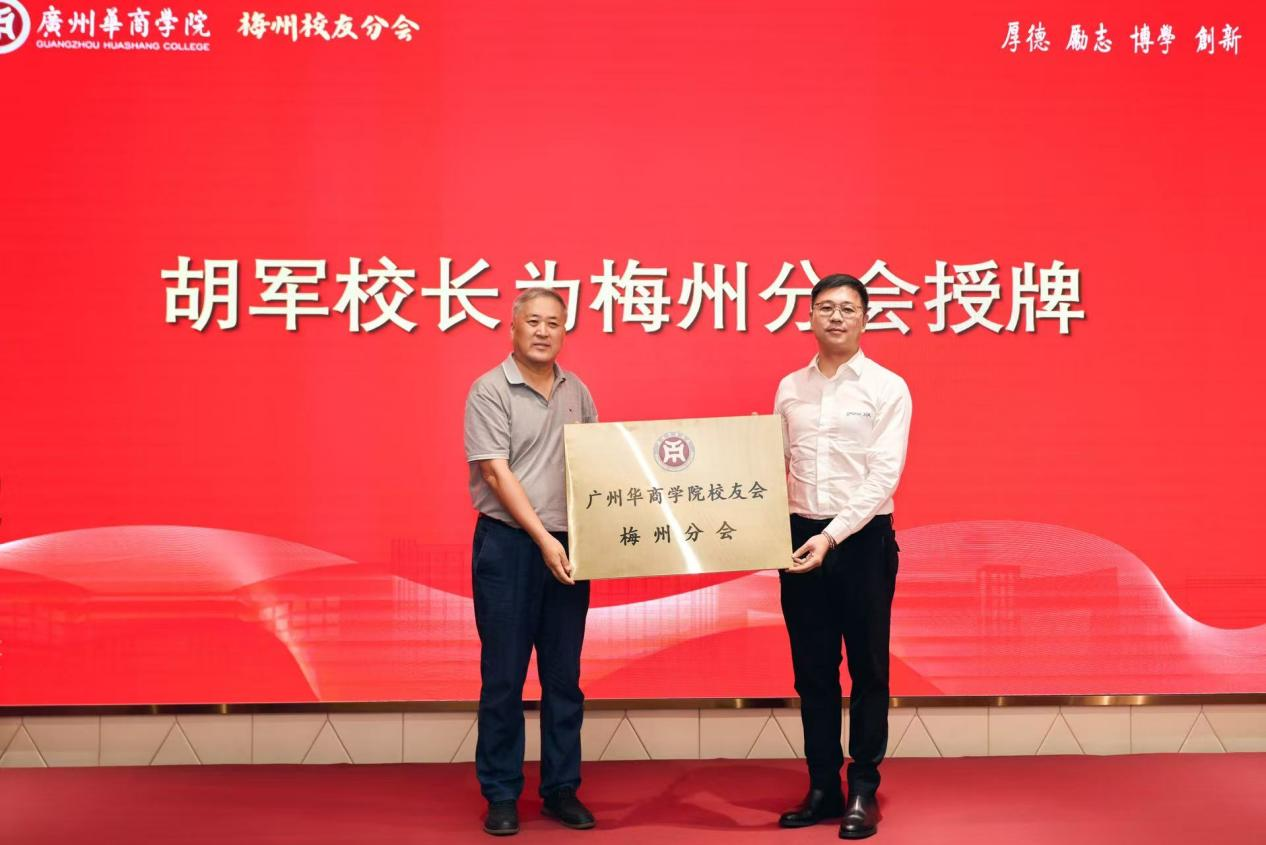 授牌仪式环节,胡军校长将“开云电子_开云(中国)校友会梅州分会”牌匾交予邓思聪会长,标志梅州校友拥有正式“精神家园”与“联络平台”。胡军校长叮嘱,希望牌匾成为分会的“精神坐标”,凝聚校友力量反哺母校、服务地方。